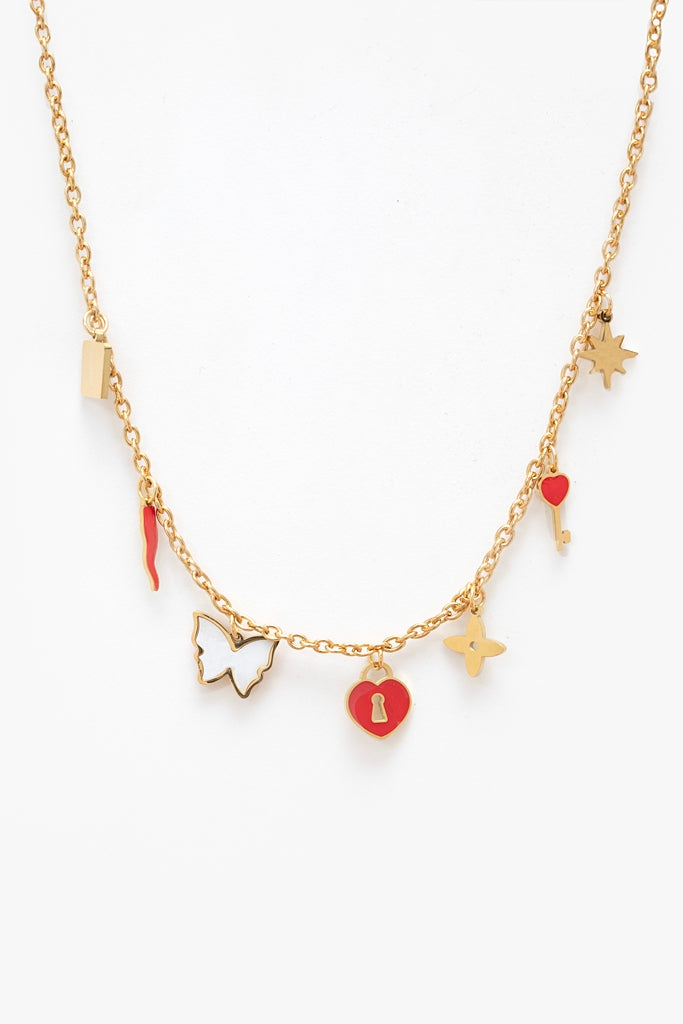 The Chilli & Locket Charm Necklace features a curated collection of charms including butterfly, red chilli, locket & key & other red & gold-toned treasures.