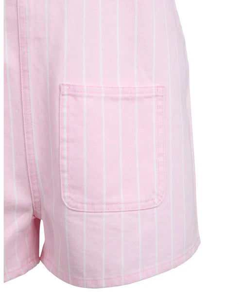 The Wilma Denim Playsuit by Eve Girl is a must-have this summer. Featuring a super cute, pink stripe denim fabric, this style has adjustable straps, front sailor pockets and twin needle stitching. Layer over any of our Eve Girl graphic tees for a perfect everyday look.