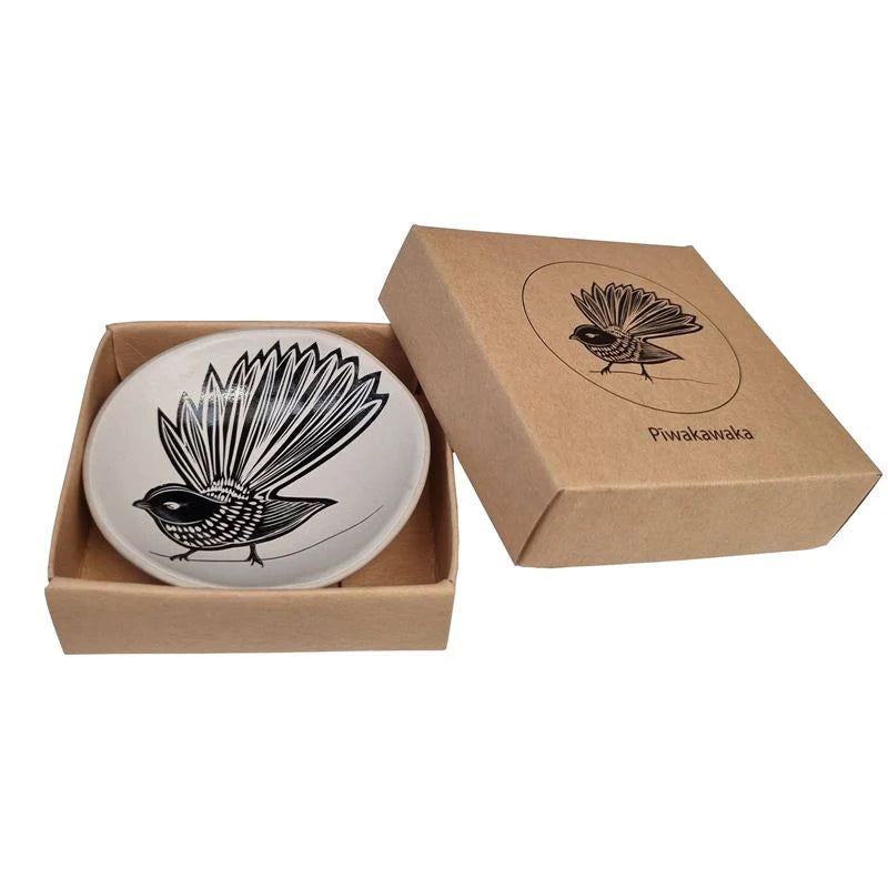 Made from white porcelain, inside semi-gloss clear glaze with decal and unglazed outside. Size 7cm diameter x 2cm high · each piece comes boxed with an image of the design on the lid. These pieces feature irregularities in both shape and form; this is part of the organic nature of the collection. Food safe, dishwasher & microwave safe. Designed in New Zealand, made in China.