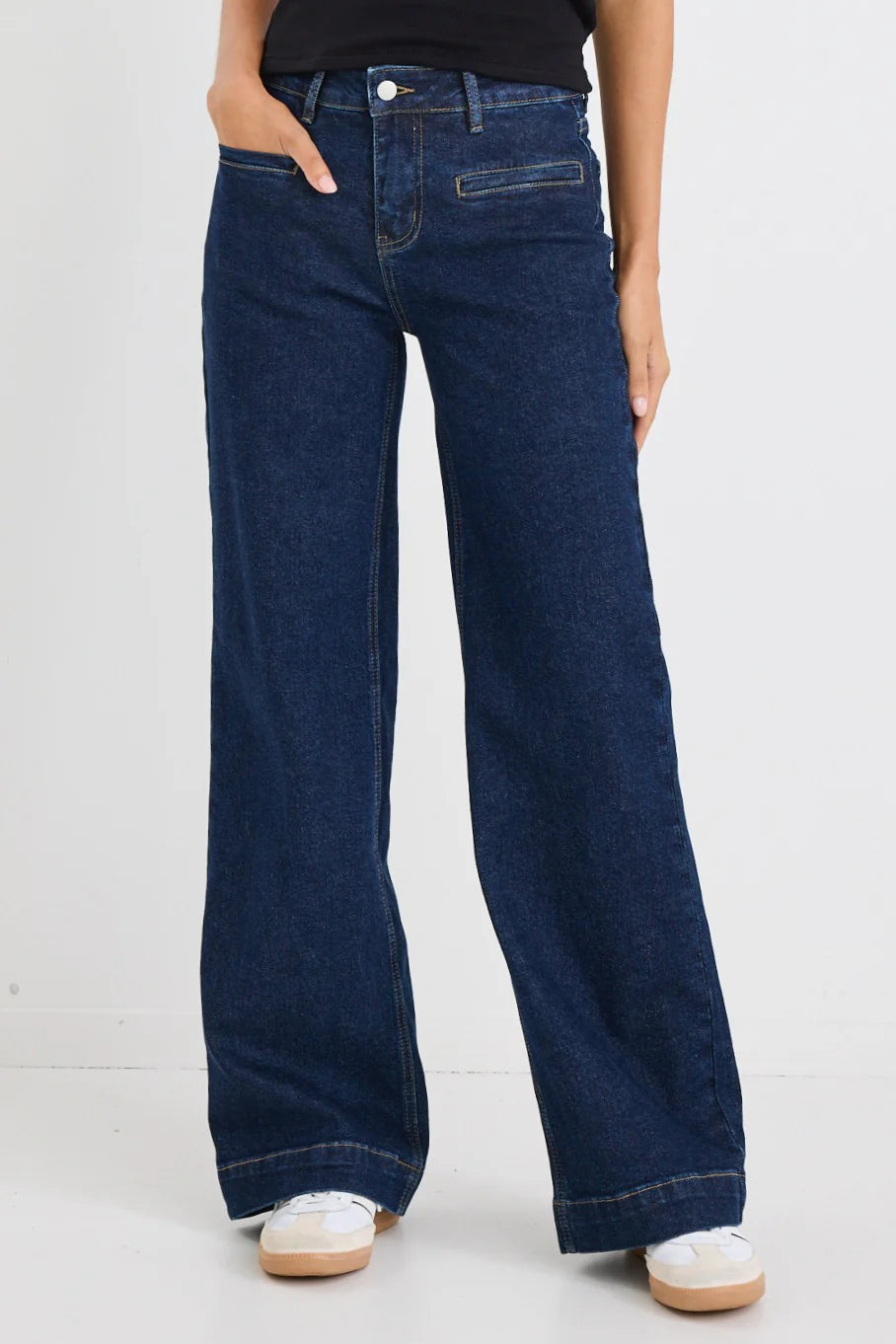 Effortlessly chic and endlessly versatile, the Concert Indigo Mid Rise Wide Leg Pocket Jean is your go-to for modern sophistication. Crafted from premium denim in a rich indigo wash, these jeans feature a flattering mid-rise waist and a wide-leg silhouette that elongates your figure. The statement front pockets add a touch of utility-chic, perfect for high-low dressing – style them with a blouse and heels for a polished look or keep it casual with a tee and sneakers. Model is wearing a size 8. She is 173cm tall. (Bust 77cm, Waist 64cm, Hips 86cm)