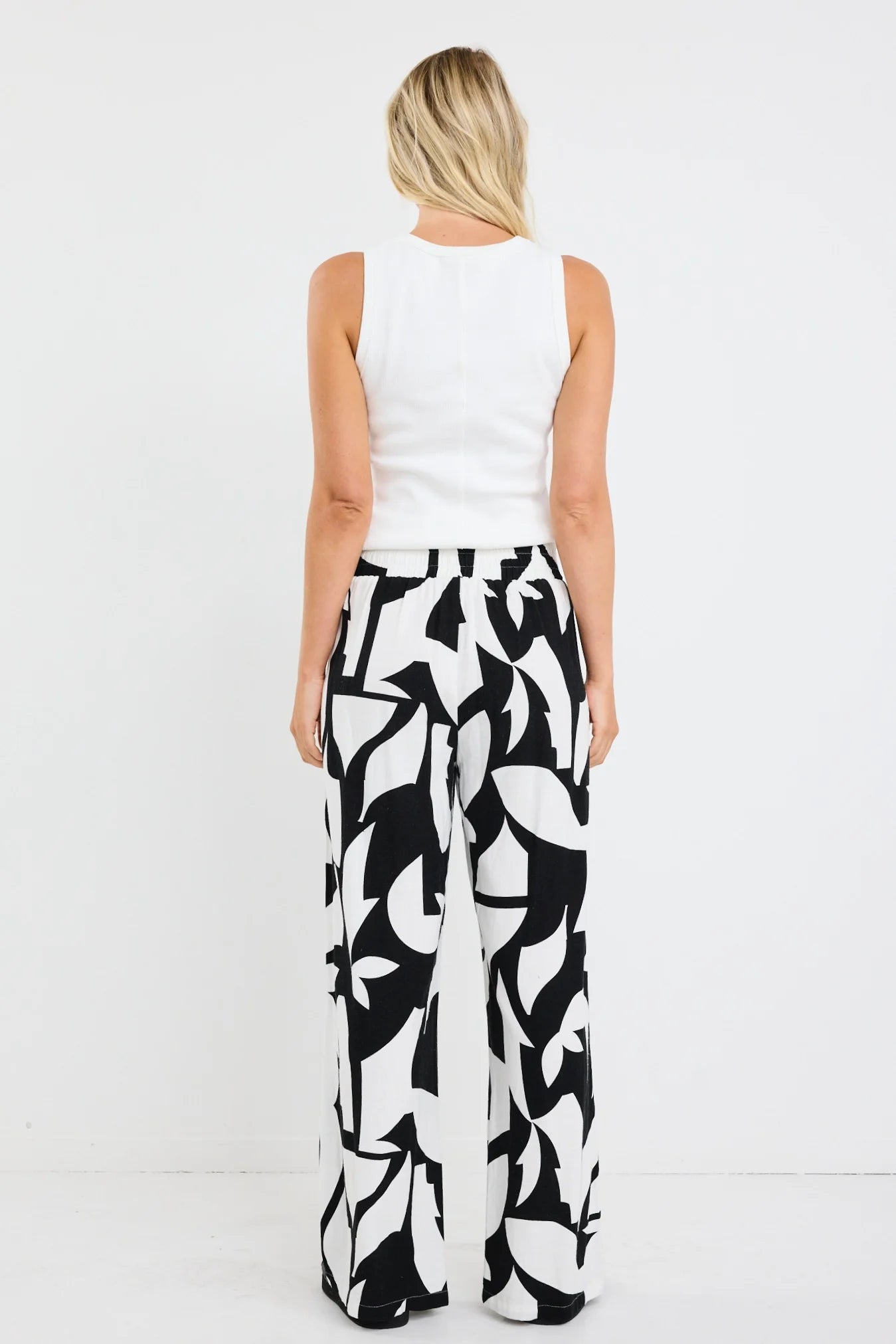 Step up your style game with our Metropolitan Black White Cutout Print Pants! Made with a soft printed linen cotton blend for easy comfort and style, these pants feature a mid rise and elastic waist for the perfect fit. Pull on design, practical pockets, and a bold black and white cutout print to make a statement.